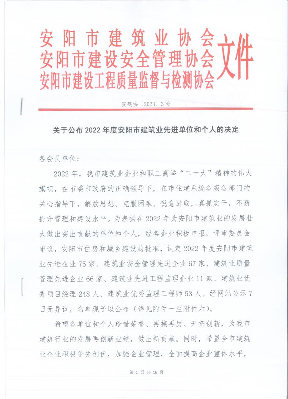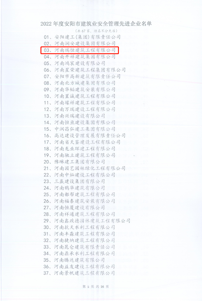 安陽(yáng)市建筑業(yè)協(xié)會(huì)、安陽(yáng)市建設(shè)安全管理協(xié)會(huì)、安陽(yáng)市建設(shè)工程質(zhì)量監(jiān)督與檢測(cè)協(xié)會(huì)聯(lián)合公布“2022年度安陽(yáng)市建筑業(yè)先進(jìn)單位、優(yōu)秀項(xiàng)目經(jīng)理(建造師)”的通知,河南瑞恒建筑工程有限公司再次榮獲2022年度“安陽(yáng)市建筑業(yè)先進(jìn)企業(yè)”、“安陽(yáng)市建筑業(yè)安全管理先進(jìn)企業(yè)”、“度安陽(yáng)市建筑業(yè)質(zhì)量管理先進(jìn)企業(yè)”和數(shù)名優(yōu)秀項(xiàng)目經(jīng)理,我司建造師馬艷紅、張富芹、魏艷玲、徐翊君、魏新、單意超、宋賓賓、朱志剛、華英麗、王雨等十人也榜上有名。